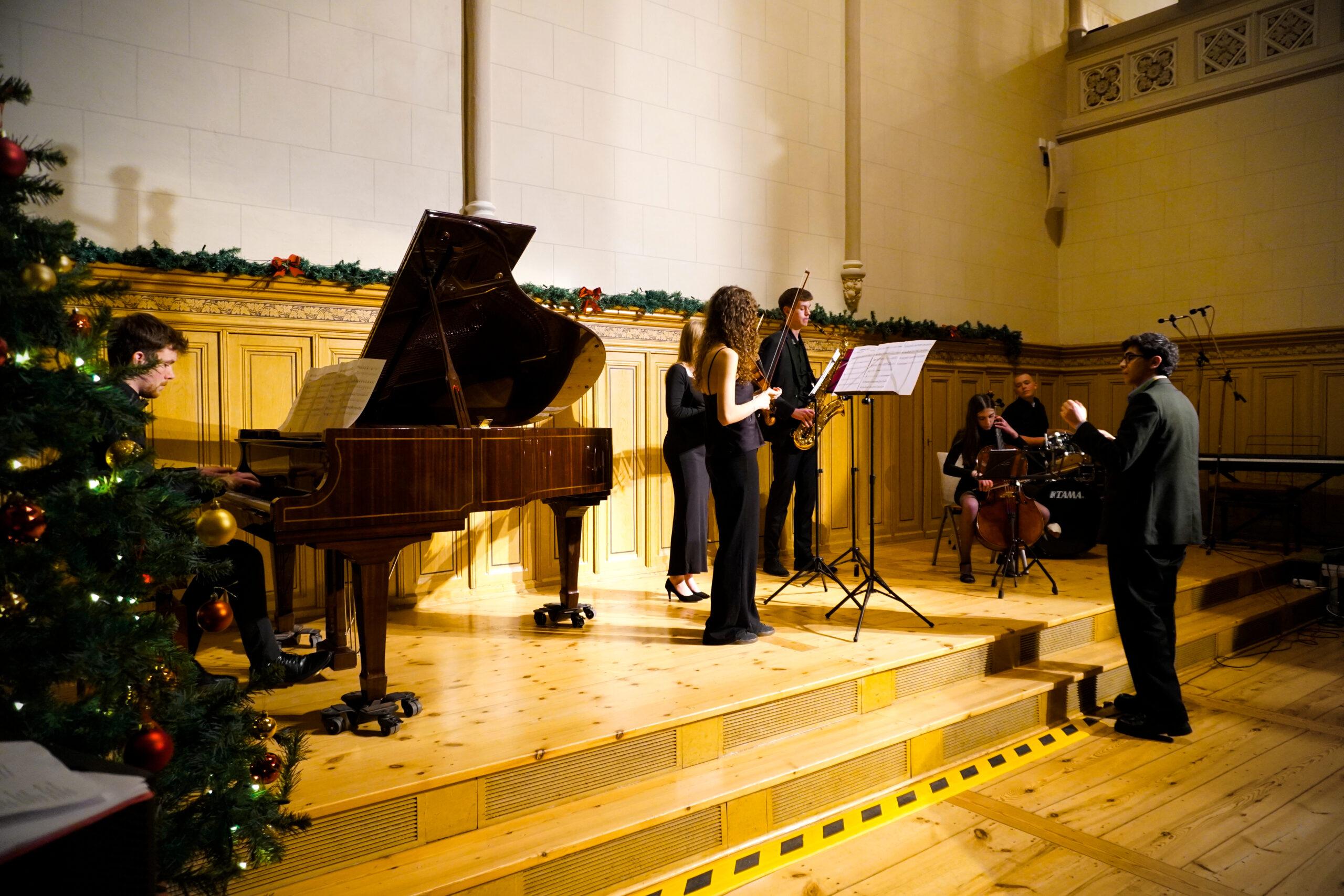 In diesem Sinne stellte das Organisationsteam des Weihnachtskonzerts, bestehend aus der Schulleitung, einigen Lehrern sowie engagierten Schülern ein volles Programm auf die Bühne, welches ebenso abwechslungsreich war wie die Mitwirkenden. Denn nicht nur erfahrene Schüler aus der Sekundarstufe II bereicherten mit ihren Talenten den Abend, sondern auch Besucher der niederen Jahrgangsstufen. So konnten Besucher des Konzertes klassischen Werken eines Streicherensembles lauschen, zusammen mit dem Musikkurs 10 bekannte Weihnachtslieder singen und einer originellen Aufführung des Theaterstückes ,,Das Lametta“ beiwohnen. Zudem trat dieses Jahr zum ersten Mal eine neue Konstellation auf die Bühne, welche sowohl aus Angehörigen des MCG Wittenberge, als auch unseres Gymnasiums bestand und sich als ,,MCGAG All-Star Ensemble“ präsentierte. Bestehend aus einem Pianisten, vier Streichern, einem Schlagzeugspieler und einem Dirigenten war das neue Ensemble die größte Instrumentalgruppe des Abends.
